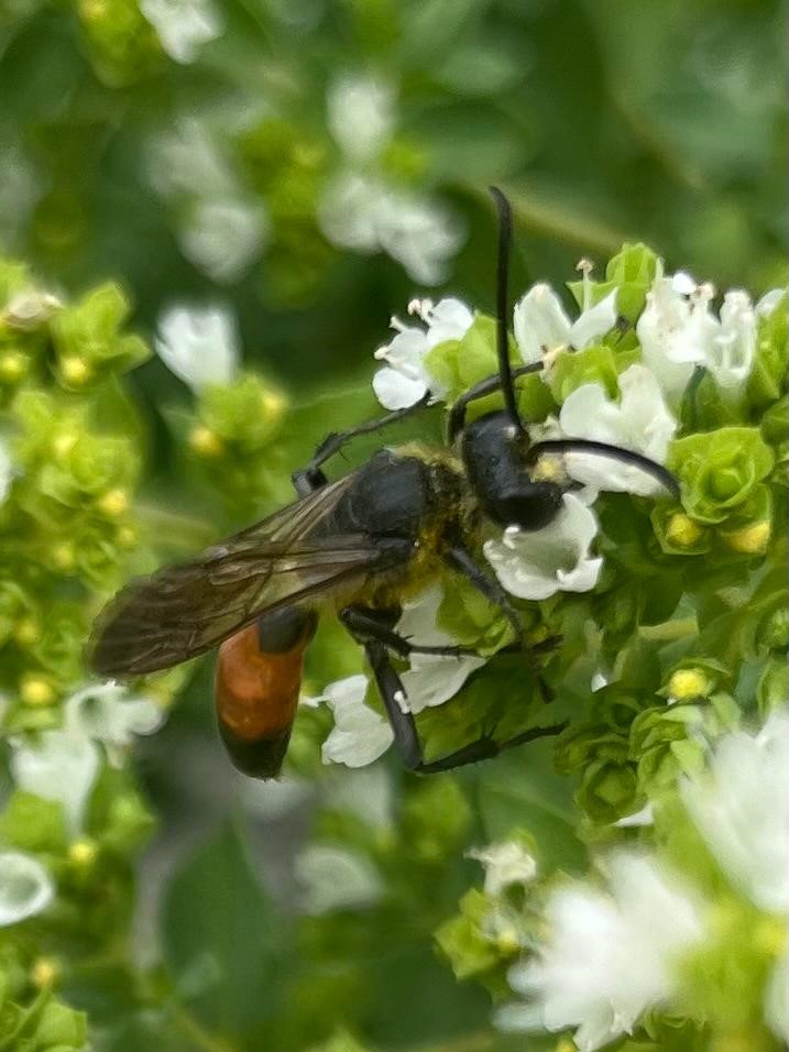 Nach Veröffentlichung des obigen Berichtes übermittelte mir Frau Martina PUCHER mehrere Fotos einer Grabwespe. Nach genauer Betrachtung der Aufnahmen kam ich zum Ergebnis, dass darauf ebenfalls eine Heuschreckensandwespe zu sehen sein müsste. Die vollständig schwarz gefärbten Beine weisen auf ein Männchen hin. Frau PUCHER hat das/die Tierchen in ihrem Garten (vor allem beim Kräuterbeet) mehrmals gesehen und zwischen 05. und 08.07.2025 die Fotos aufgenommen (siehe Abb. 18 + 19). Die Fundstelle befindet sich in der Ortschaft Semslach (KG Söbriach, Gemeinde Obervellach, Kärnten) in 690 m Seehöhe.